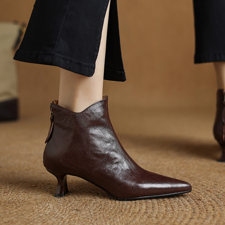 手抓羊皮棕色2024秋季新款尖头粗跟猪里皮复古短靴