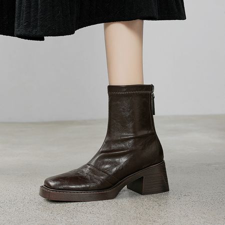 2024秋冬小个子厚底手抓纹弹力瘦瘦靴粗跟后拉链圆头英伦短靴