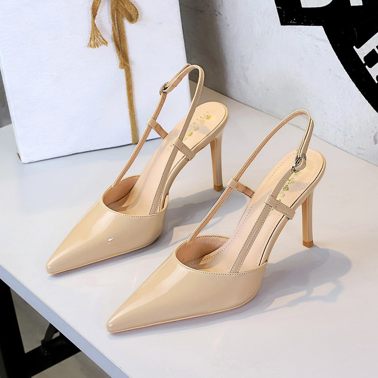 欧美风简约镂空尖头高跟鞋细跟漆皮后空后绊带浅口性感女单鞋
