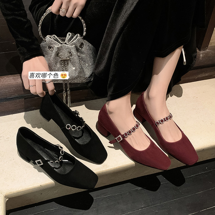 【单鞋爆款 现货已到铺】方头浅口高跟鞋 一字带翻毛皮玛丽珍鞋 简约粗跟单鞋 数据已测 上架即卖