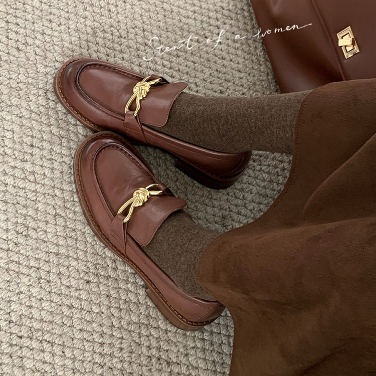 金属蝴蝶扣 水洗牛皮擦色乐福鞋女 2026春秋新款 平底圆头单鞋中口深口鞋 猪皮里33-40大小码