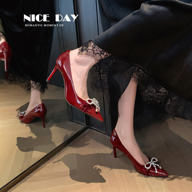 【春季爆款 数据超好】水钻漆皮蝴蝶结尖头高跟鞋 细跟一脚蹬单鞋 数据已测 上架即卖
