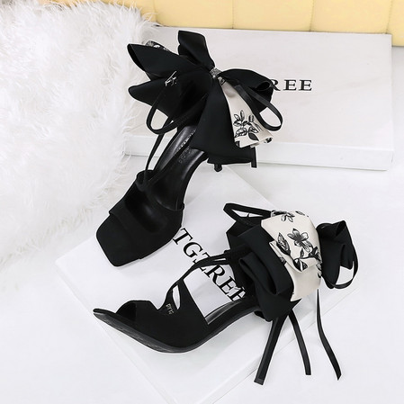 欧美风绒面时尚超高跟女鞋鱼嘴一字扣丝带蝴蝶结凉鞋