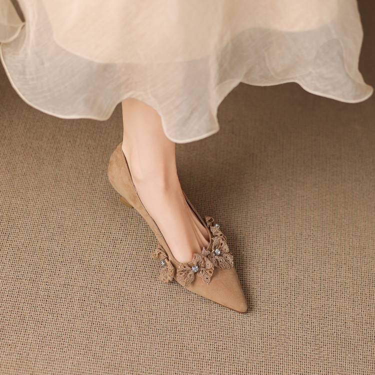 5cm法式优雅尖头浅口单鞋女春款蕾丝水钻蝴蝶结气质高跟鞋
