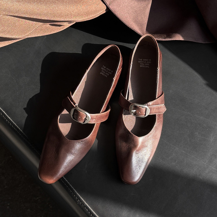 精致小方头舒适百搭头层牛皮里外全皮浅口金属扣百搭韩版小单鞋