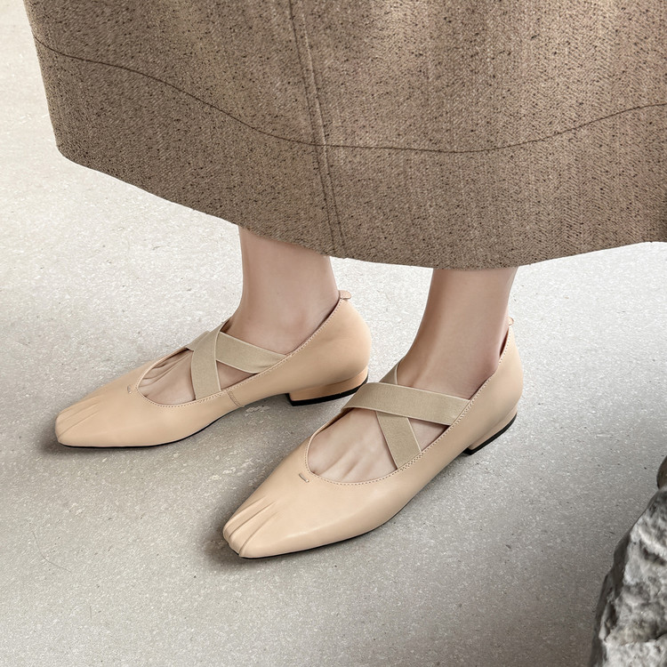浅口头层牛皮百搭低跟交叉带韩版里外全皮芭蕾鞋浅口单鞋