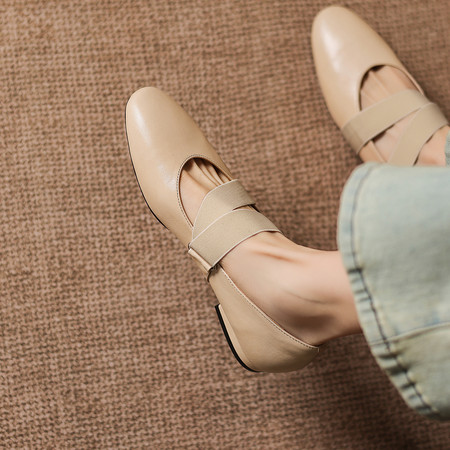 圆头舒适百搭交叉带韩版里外全皮舒适低跟浅口单鞋