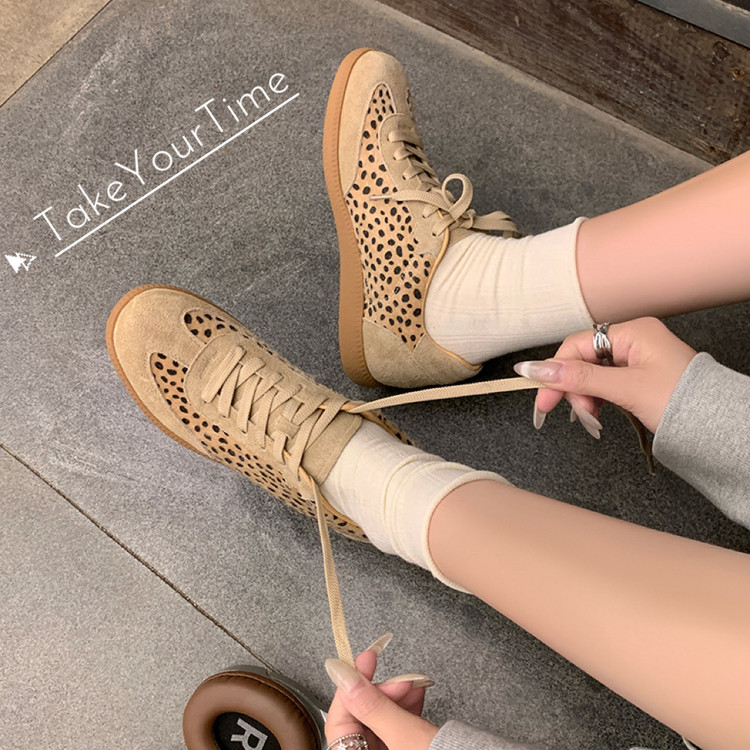 德训鞋 豹纹平底系带春秋女鞋单 2026新款 猪皮内里 内增高女鞋春季单鞋运动风