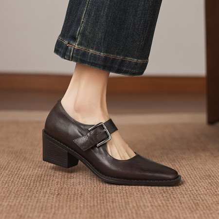 头层牛皮方头粗跟法式玛丽珍