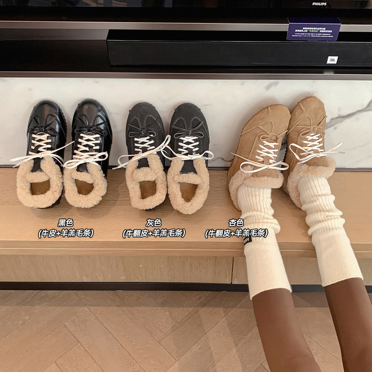 休闲系带羊羔毛装饰蝴蝶结毛毛单鞋