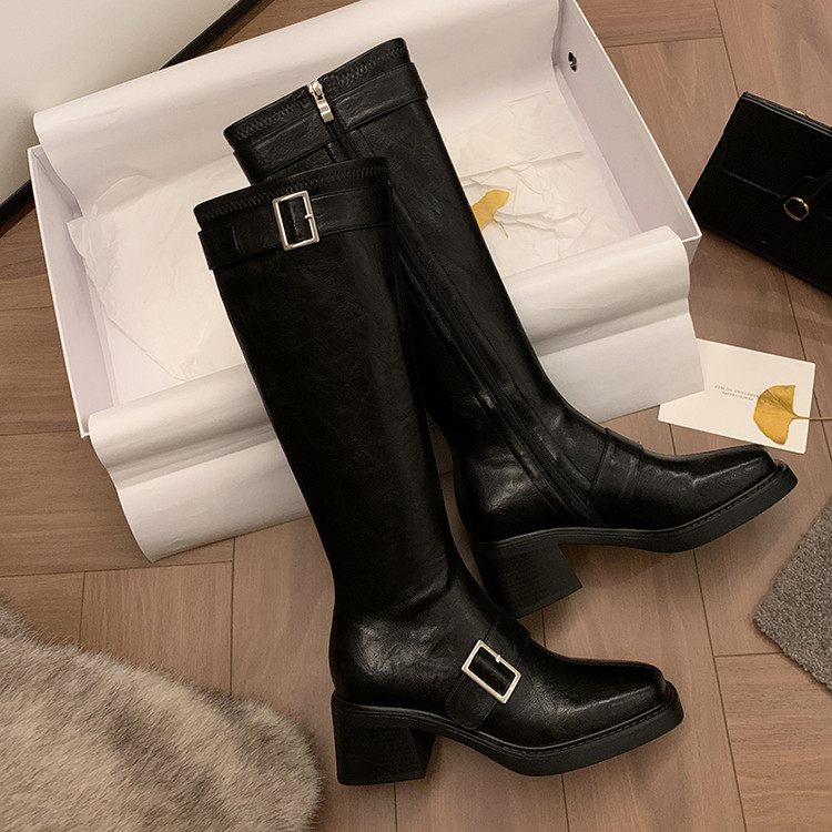 2025新款弹力靴 好款大量现货 粗跟方头高靴长靴不过膝女靴子 瘦瘦靴 猪皮了 皮带扣女靴子