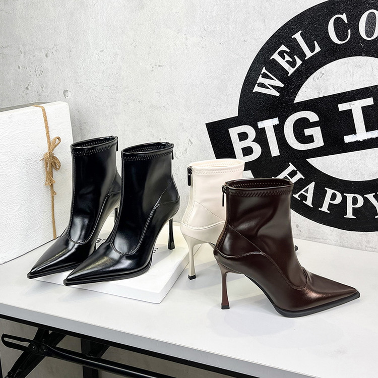 欧美风时装靴子女尖头性感细跟拼接裸靴瘦瘦靴拉链高跟短靴
