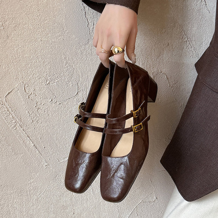 头层羊皮 粗跟 方头