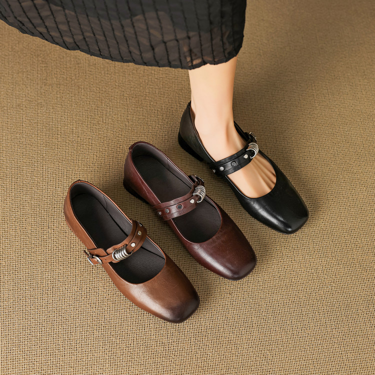 水洗牛皮复古擦色一字带粗跟玛丽珍单鞋~!现货