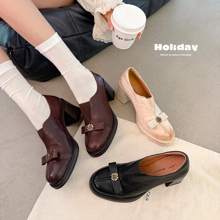 复古摩登感~现货 现货蝴蝶结圆头高跟里外全皮单鞋