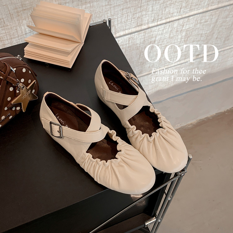 里外全头层~花朵皱皱感交叉带内增高芭蕾舞单鞋