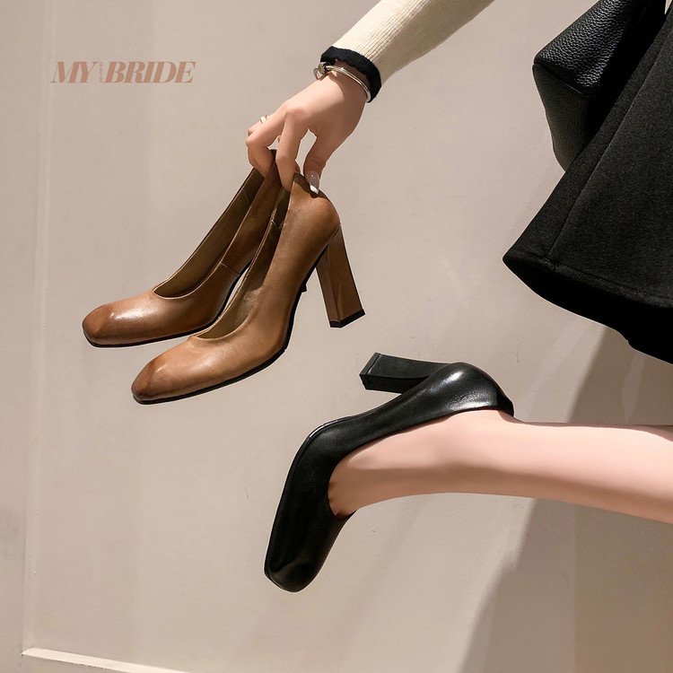 粗跟方头水洗牛皮单鞋大码34-42