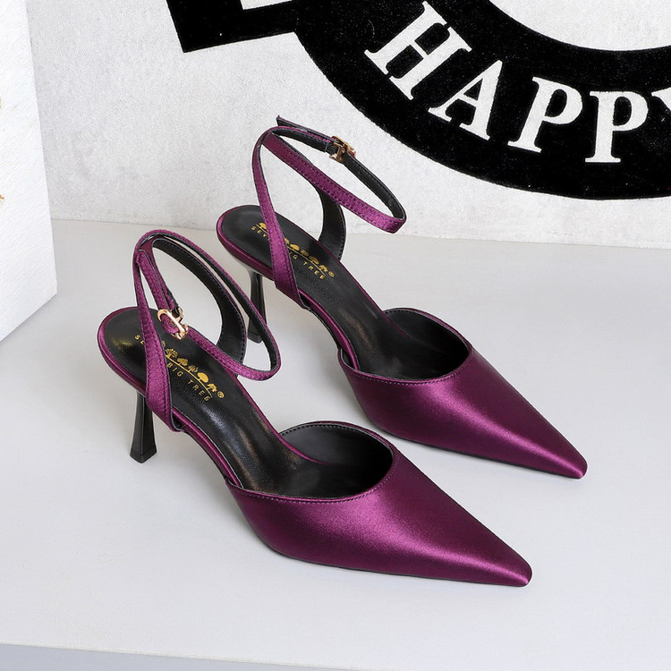 欧美风性感夜店镂空细跟女鞋尖头浅口绸缎后空一字带