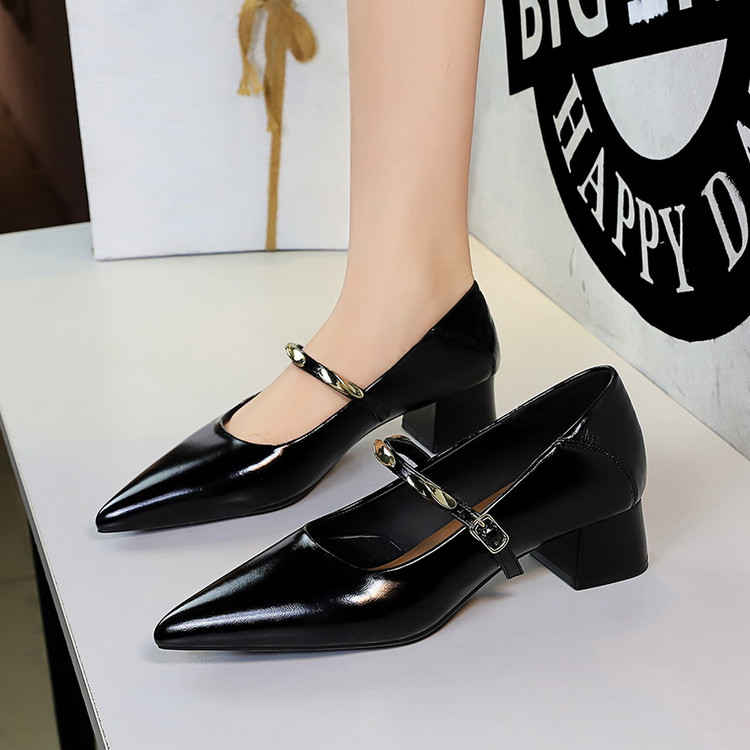 韩版复古柔帕开边珠尖头浅口简约一字扣粗跟不累脚中跟单鞋
