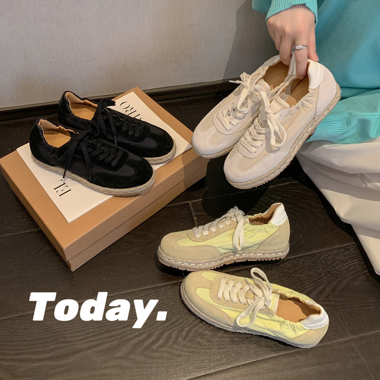 内增高草编德训鞋女 平底圆头松糕厚底单鞋系带 2026新款深口女鞋单春秋新款