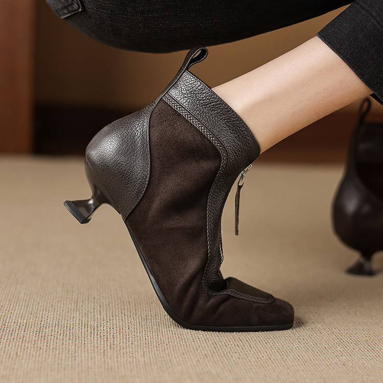 秋冬前拉链羊皮真皮4.5cm短靴小方头低跟粗跟优雅百搭瘦瘦靴