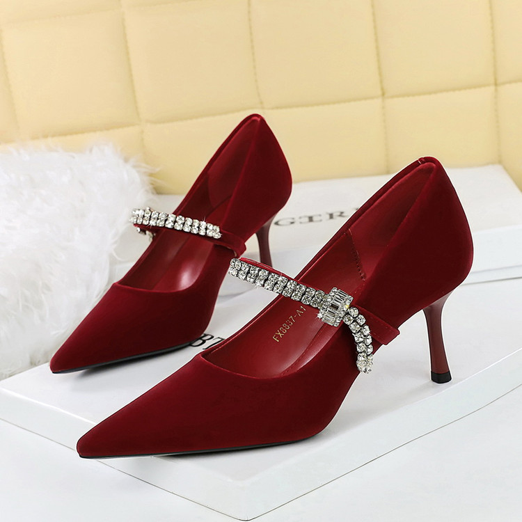 欧美尖头浅口单鞋水钻一字带绒面细跟高跟鞋日常宴会女鞋