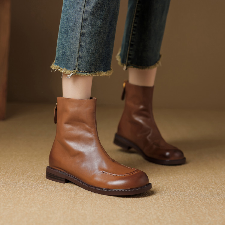 真皮复古粗跟短靴