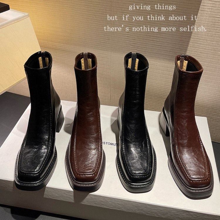 2025新款弹力靴 粗跟方头靴子秋冬短靴女 猪皮里