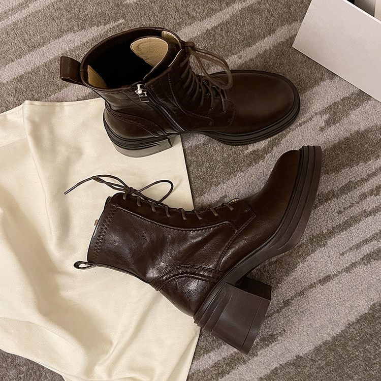 弹力靴2025新款 粗跟厚底马丁靴 前系带圆头瘦瘦靴 弹力靴 猪皮里