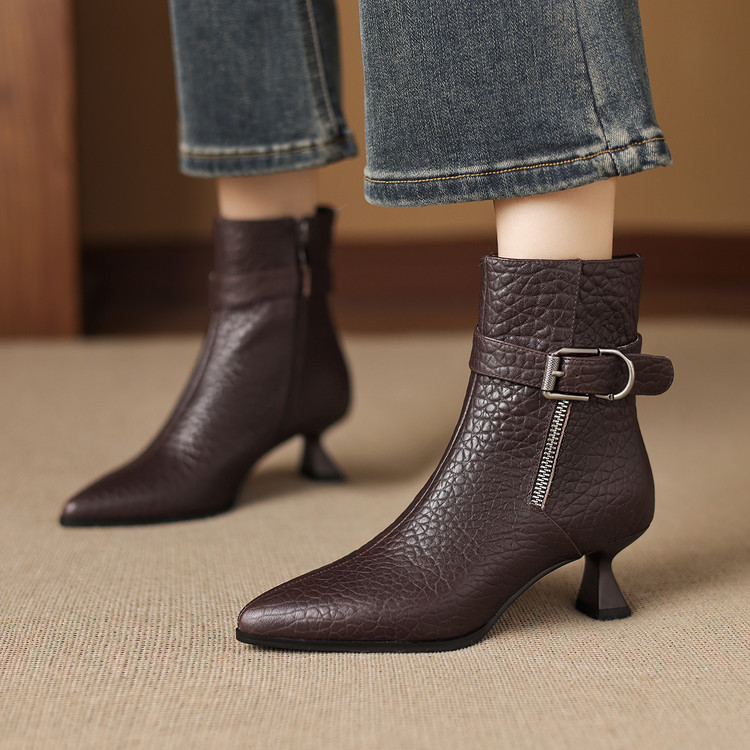 真皮靴子女2025新款秋冬季单靴气质女鞋加绒头层牛皮细跟尖头高跟短靴