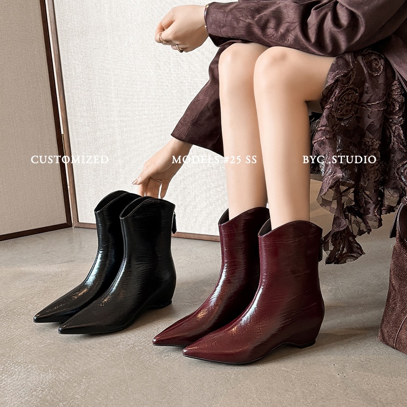 尖圆头油蜡牛皮内增高气质短靴~~全现货~~