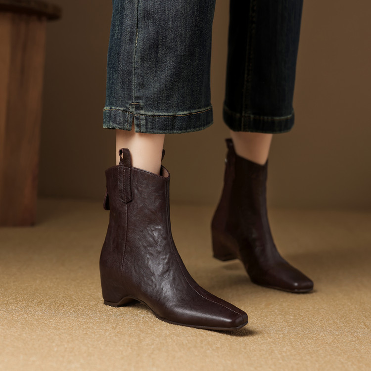 真皮复古粗跟短靴