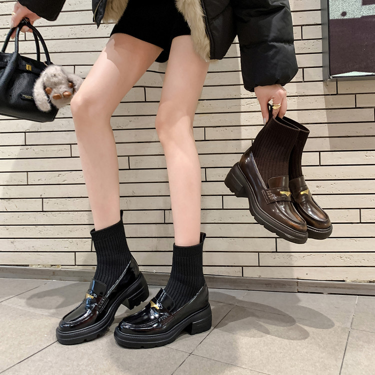 老钱风~巨好看加绒短靴 粗跟针织拼接袜靴 圆头套筒弹力瘦瘦靴 数据已测 上架即卖
