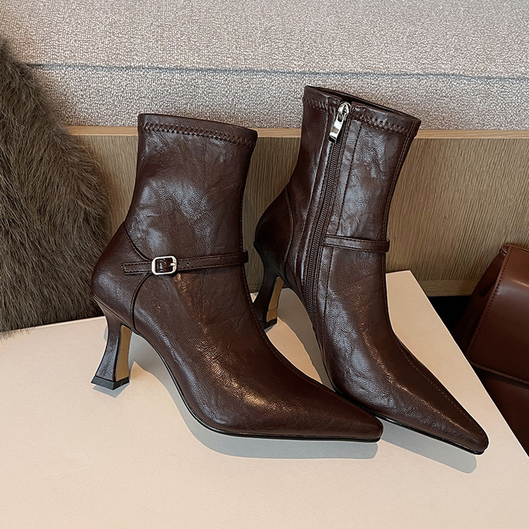 简约百搭秋冬短靴女 侧拉链尖头高跟瘦瘦靴短筒 弹力靴短筒 皮带扣 猪皮里