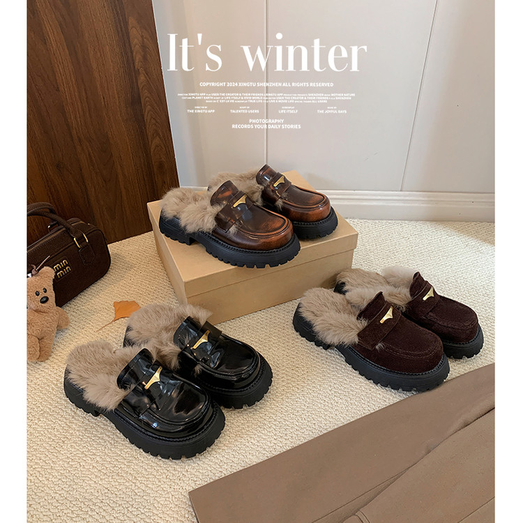 真皮海鸥擦色拖鞋 兔毛绒里复古鞋