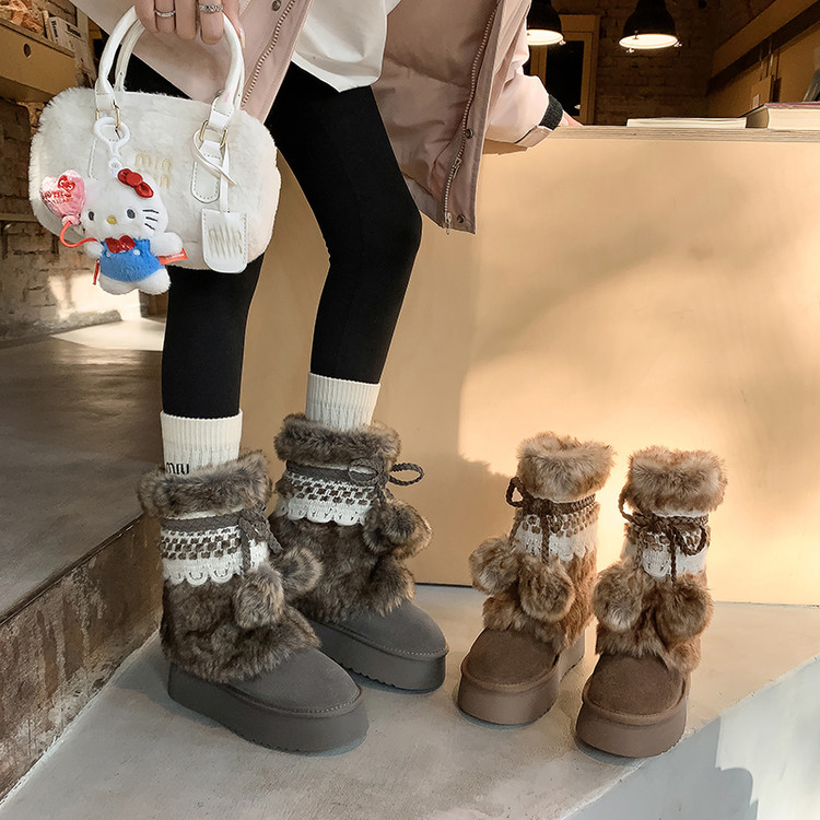 【爆款推荐】超保暖~厚底毛毛雪地靴 花边绑带加绒加厚保暖中筒毛毛靴 数据已测 上架即卖