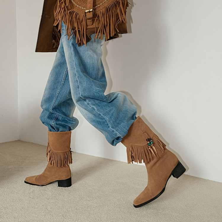 头层牛翻~ 波西米亚风~流苏中筒靴