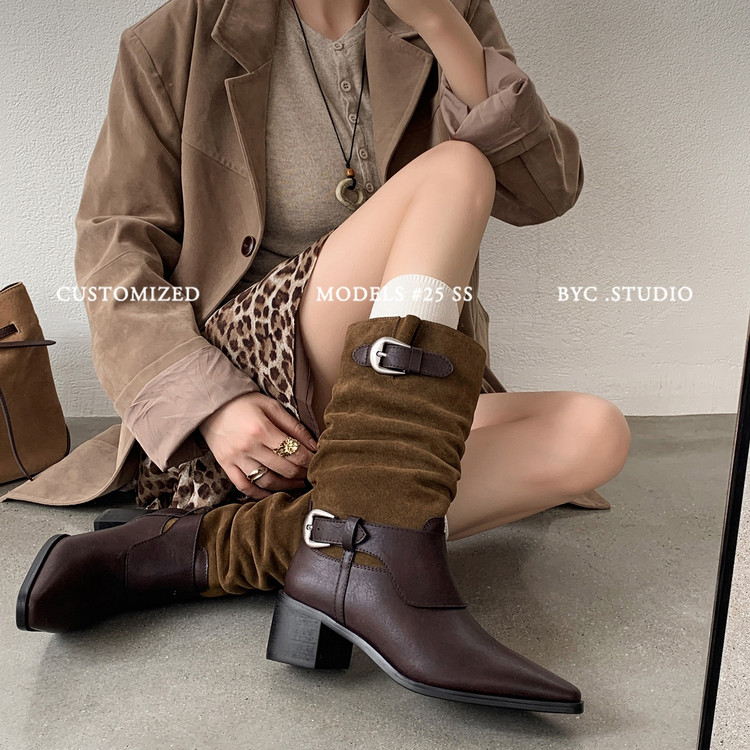 升级版方圆头拼接粗跟骑士靴堆堆靴~~显瘦显腿长~~