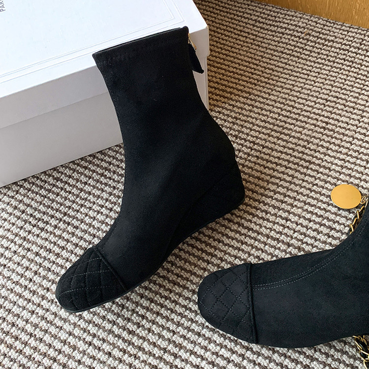 小香风 菱格纹 磨砂弹力靴短筒靴 坡跟圆头女靴短靴子 2025新款后拉链