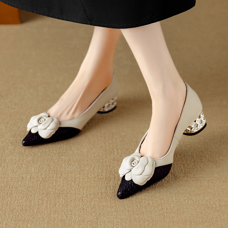 2025秋季新款鱼皮拼接山茶花小香风单鞋 羊皮里羊皮垫 40码不加价可退换