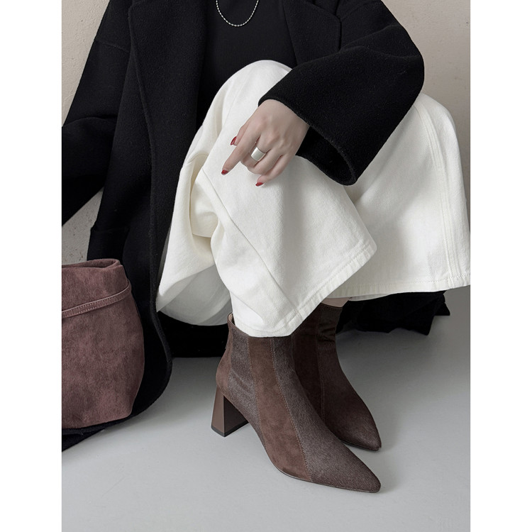 气质超火羊反绒拼接马毛短靴 性感缪斯女神粗高跟短靴