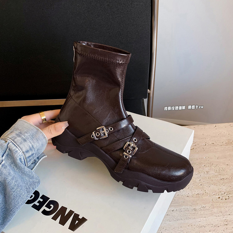粗跟运动底弹力靴瘦瘦靴厚底复古短靴大码34-42