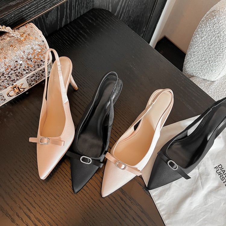 淑女风~蝴蝶结真丝水钻尖头高跟鞋 细跟绸缎包头后空凉鞋 数据已测 上架必爆