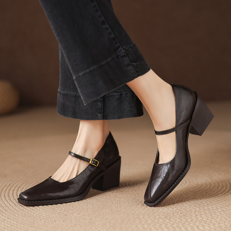 2026春季拼接头层羊皮里外全皮高跟玛丽珍一字式扣带浅口小单鞋