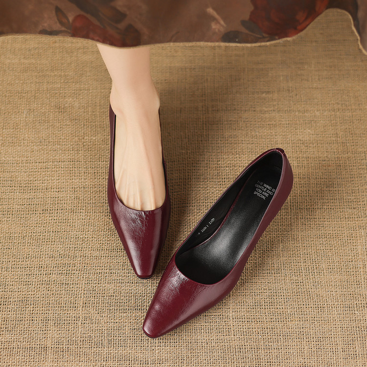 复古浅口单鞋细跟通勤高跟鞋头层牛皮小方头