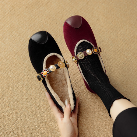 2025年复古真皮珍珠玛丽珍鞋 头层羊皮+羊羔毛垫毛毛鞋秋冬季新款圆头平底毛里保暖单鞋
