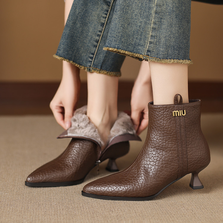 超软牛皮小短靴女冬季羊羔毛靴细跟尖头高跟鞋真皮软皮法式洋气及踝靴