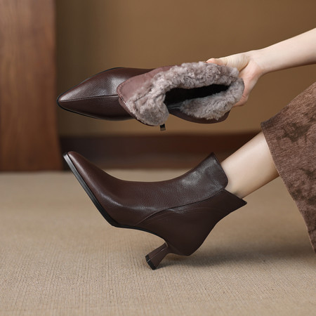 法式洋气小短靴女冬季加绒加厚棉鞋细跟软底高跟鞋尖头雪地靴羊毛