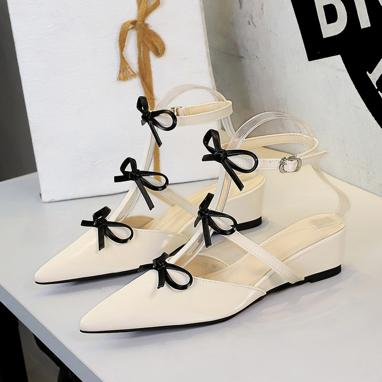 法式甜美拖鞋尖头浅口蝴蝶结坡跟一字式扣带外穿时尚半拖女
