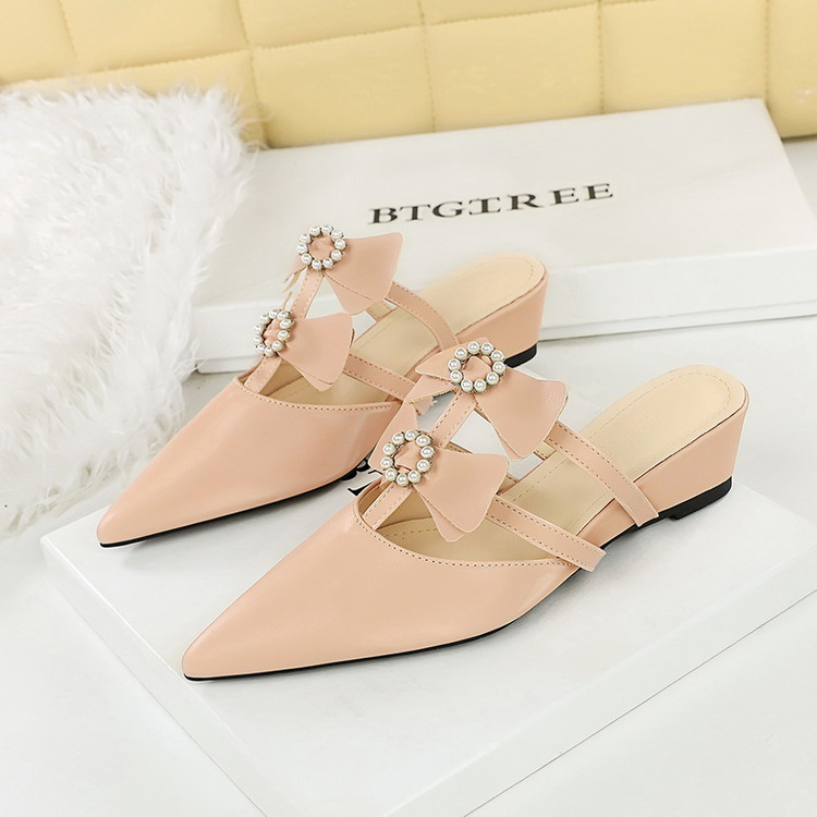 坡跟增高凉拖女外穿尖头珍珠蝴蝶结镂空裸色百搭包头半拖鞋